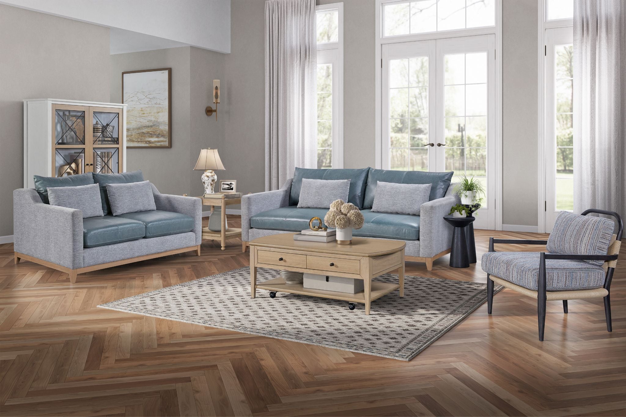 The Mist Leather Loveseat showcases a striking two-tone design that blends soft blue-gray leather with a textured fabric frame for a sophisticated, layered look. Its compact size makes it perfect for smaller spaces, while still offering generous comfort with plush seat cushions and supportive back pillows. The mix of materials adds visual interest and a tailored finish that elevates any room. Subtle wood base detailing completes the piece with a touch of natural warmth and durability.