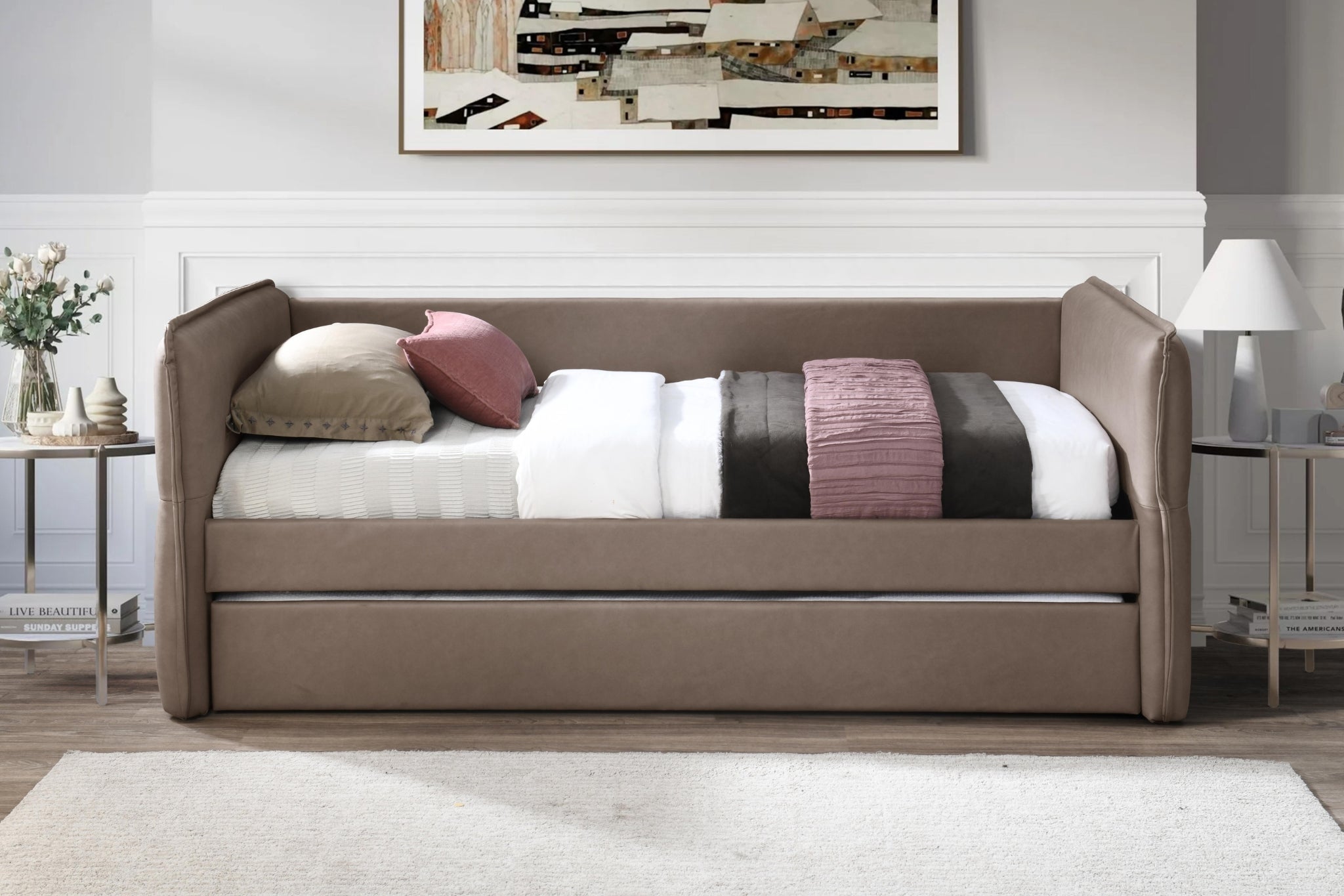 Transform any bedroom into a cozy oasis with our Trina Upholstered Trundle Bed. Available in 3 elegant colors, dusty rose, mocha and tan, this bed combines style and function with a convenient trundle for added sleeping space. The luxurious upholstered design adds a touch of comfort to your room. Sweet dreams await!